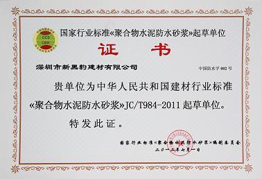 我公司為中華人民共和國建材行業(yè)標(biāo)準(zhǔn)《聚合物水泥防水漿料》JC/T984-2011起草單位.并獲得了國家行業(yè)標(biāo)準(zhǔn)《聚合物水泥防水漿料》編制委員會頒發(fā)證書。國建材行業(yè)標(biāo)準(zhǔn)《聚合物水泥防水砂料》JC/T984-2011已于2012年7月1日實施。