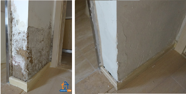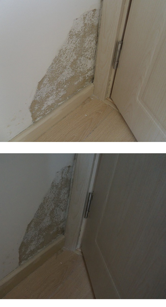 記者在現(xiàn)場(chǎng)看到, 410號(hào)房和718號(hào)房同樣位置,墻壁重新修補(bǔ)粉刷的痕跡明顯,2912房間墻角處的剝落仍未修補(bǔ),2916房未見(jiàn)明顯的滲水痕跡。中海相關(guān)負(fù)責(zé)人解釋,410號(hào)房的墻壁問(wèn)題,是由于該墻壁外接露臺(tái),前期施工中露臺(tái)與墻壁間存在縫隙導(dǎo)致滲水,718房間的滲水,是因?yàn)楣┧艿澜涌诖嬖趩?wèn)題;而2912墻角處的剝落,目前尚未查清究竟是供水管道滲水,還是建筑工人用水不當(dāng)導(dǎo)致墻壁被浸泡。