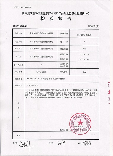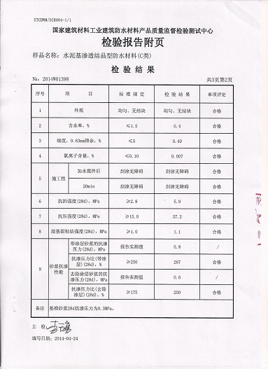 為了給客戶提供更好的產(chǎn)品,我公司現(xiàn)已對(duì)水泥基滲透結(jié)晶型防水材料的配方進(jìn)行了升級(jí),并委托國(guó)家建筑材料工業(yè)建筑防水材料產(chǎn)品質(zhì)量監(jiān)督檢驗(yàn)測(cè)試中心對(duì)該產(chǎn)品按照國(guó)家強(qiáng)制標(biāo)準(zhǔn)GB18445-2012進(jìn)行了型式檢驗(yàn)(即按國(guó)家標(biāo)準(zhǔn)所有指標(biāo)項(xiàng)目檢驗(yàn))。我公司升級(jí)后的水泥基滲透結(jié)晶型防水材料通過國(guó)家建筑材料工業(yè)建筑防水材料產(chǎn)品質(zhì)量監(jiān)督檢驗(yàn)測(cè)試中心型式檢驗(yàn)后,完全能達(dá)到國(guó)家標(biāo)準(zhǔn)。