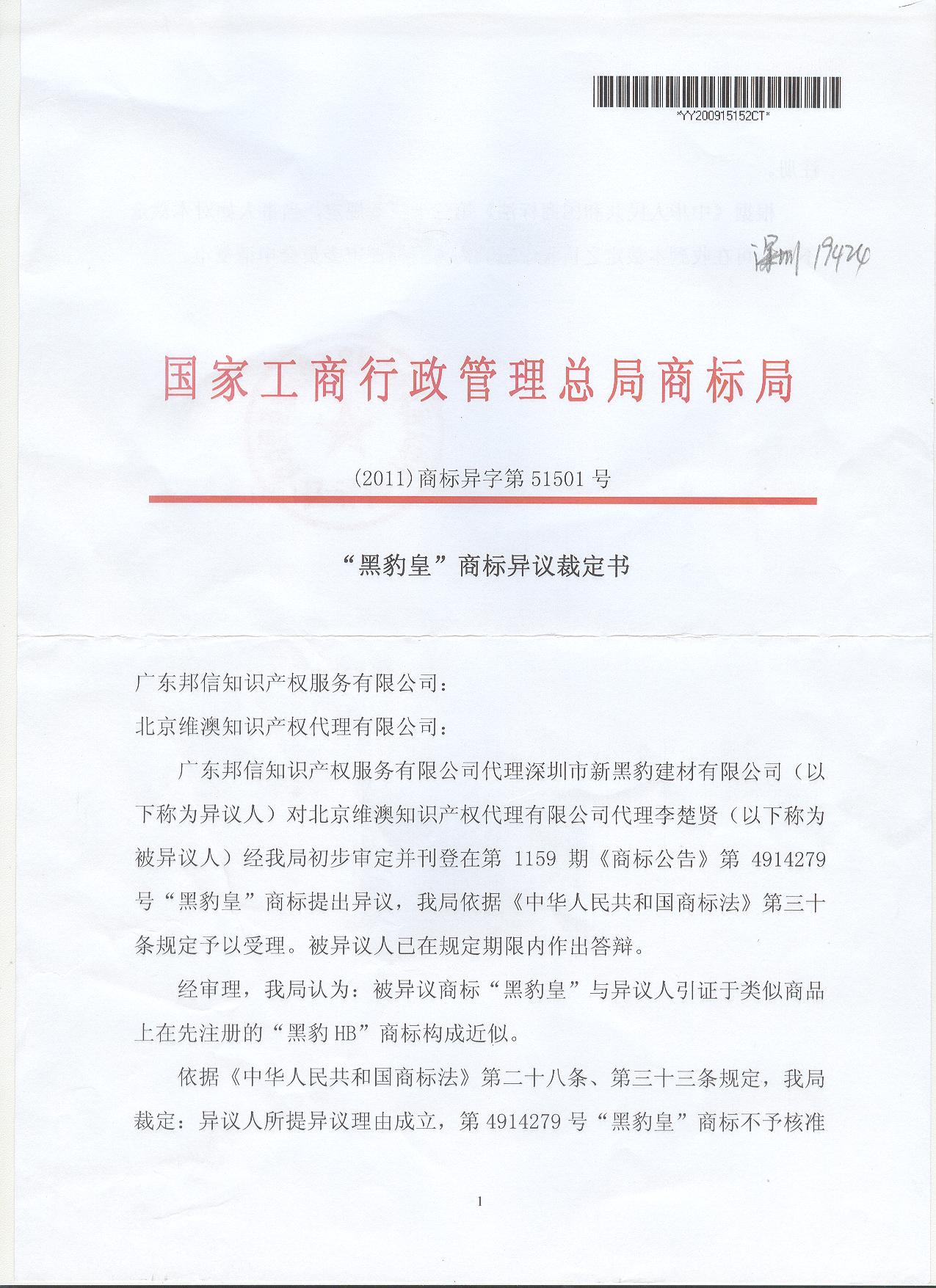 近期,因商標“黑豹皇”與我公司的廣東省著名商標“黑豹”構(gòu)成近似,經(jīng)國家工商行政管理局商標總局裁定不予核準注冊。(附:“黑豹皇”商標異議裁定書)