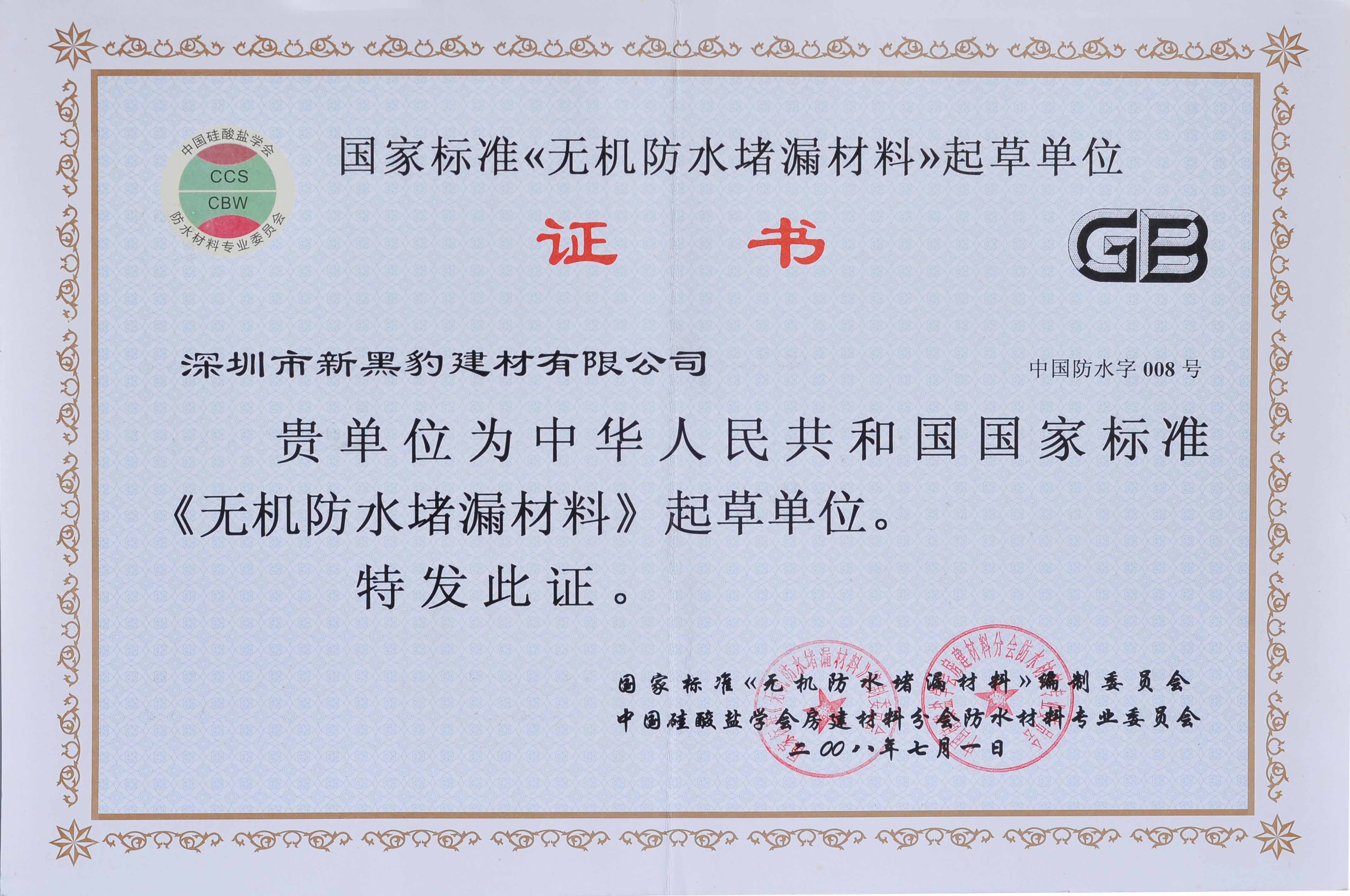 2008年,深圳市新黑豹建材有限公司為中華人民共和國(guó)國(guó)際標(biāo)準(zhǔn)《無(wú)機(jī)防水堵漏材料》起草單位之一,《無(wú)機(jī)防水堵漏材料》編制委員會(huì)特發(fā)此證。