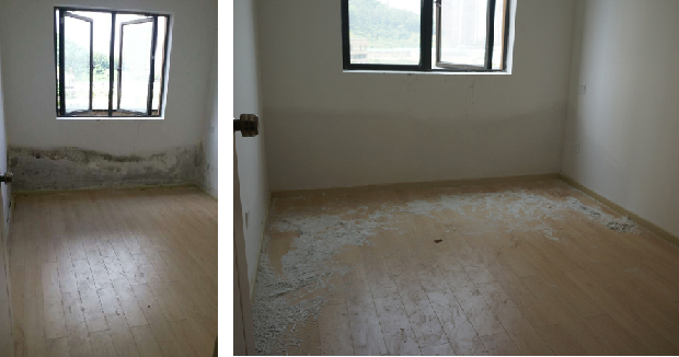 記者在現(xiàn)場(chǎng)看到, 410號(hào)房和718號(hào)房同樣位置,墻壁重新修補(bǔ)粉刷的痕跡明顯,2912房間墻角處的剝落仍未修補(bǔ),2916房未見(jiàn)明顯的滲水痕跡。中海相關(guān)負(fù)責(zé)人解釋,410號(hào)房的墻壁問(wèn)題,是由于該墻壁外接露臺(tái),前期施工中露臺(tái)與墻壁間存在縫隙導(dǎo)致滲水,718房間的滲水,是因?yàn)楣┧艿澜涌诖嬖趩?wèn)題;而2912墻角處的剝落,目前尚未查清究竟是供水管道滲水,還是建筑工人用水不當(dāng)導(dǎo)致墻壁被浸泡。