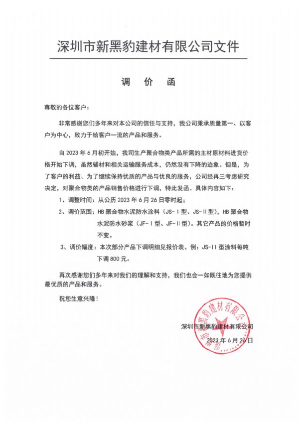 尊敬的各位客戶: 非常感謝您們多年來(lái)對(duì)本公司的信任與支持,我公司秉承質(zhì)量第一、以客戶為中心,致力于給客戶一流的產(chǎn)品和服務(wù)。 自2023年6月初開始,我司生產(chǎn)聚合物類產(chǎn)品所需的主材原材料進(jìn)貨價(jià)格開始下調(diào),雖然輔材和相關(guān)運(yùn)輸服務(wù)成本,仍然沒有下降的跡象。但是,為了客戶的利益、為了繼續(xù)保持優(yōu)質(zhì)的產(chǎn)品與優(yōu)良的服務(wù),公司經(jīng)再三考慮研究決定,對(duì)聚合物類的產(chǎn)品銷售價(jià)格進(jìn)行下調(diào),特此發(fā)函。具體內(nèi)容如下: 1、調(diào)整時(shí)間:從公歷2023年6月26日零時(shí)起; 2、調(diào)價(jià)范圍:HB聚合物水泥防水涂料(JS-Ⅰ型、JS-Ⅱ型),HB聚合物水泥防水砂漿(JF-Ⅰ型、JF-Ⅱ型)。其它產(chǎn)品的價(jià)格暫時(shí)不變。 3、調(diào)價(jià)幅度:本次部分產(chǎn)品下調(diào)明細(xì)見報(bào)價(jià)表。例:JS-II型涂料每噸下調(diào)800元。 再次感謝您們多年來(lái)對(duì)我們的理解和支持,我們也會(huì)一如既往地為您提供最優(yōu)質(zhì)的產(chǎn)品和服務(wù)。 祝您生意興??! 深圳市新黑豹建材有限公司 2023年6月25日